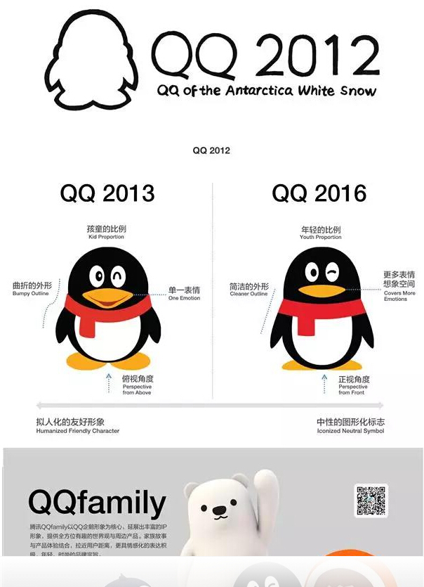 而且,即便是符合自身定位的動(dòng)物形象,也只有通過很強(qiáng)的設(shè)計(jì)和再創(chuàng)造才能發(fā)揮出它真正的價(jià)值。如企鵝QQ的形象,從其誕生之初到現(xiàn)在,已經(jīng)經(jīng)過n次的設(shè)計(jì)和改版。