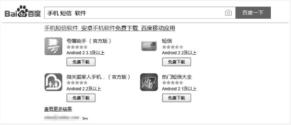 (2)搜索“手機短信軟件”,短信也沒有出現(xiàn),建議跟進開放平臺展現(xiàn),因為從下載量來說,短信的應(yīng)該是大的,但是卻沒有下載量,可能是人工干預(yù)或者開放平臺的緣故。