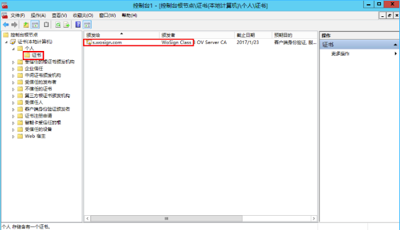 ? 在控制臺的左側(cè)顯示證書樹形列表,選擇“個人”->“證書”,右鍵單擊,選擇“所有任務"-〉"導入”, 根據(jù)"證書導入向?qū)А钡奶崾荆瑢隤FX文件 (此過程當中有一步非常重要: “根據(jù)證書內(nèi)容自動選擇存儲區(qū)”)。安裝過程當中需要輸入密碼為您當時設(shè)置的密碼。導入成功后,可以看到如圖所示的證書信息。