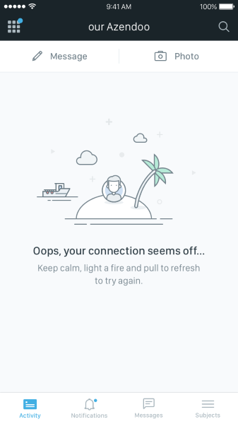 當(dāng)同步或鏈接斷開,或者內(nèi)容加載失敗時(shí),應(yīng)該告知用戶。要預(yù)先告訴他們。由于沒(méi)有數(shù)據(jù),可以使用空狀態(tài)填補(bǔ)空隙。可悲事實(shí)是,許多空狀態(tài)看起來(lái)……真的是空的。下面的例子中,錯(cuò)誤界面只說(shuō)“發(fā)生了錯(cuò)誤”,沒(méi)有提供一點(diǎn)有用的信息。