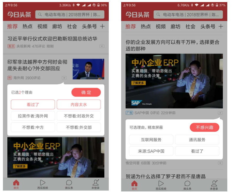 像頭條可以直接屏蔽,鳳凰新聞會讓其選擇原因,而其他的如新浪、網(wǎng)易、天天快報就并不能使用這一功能了。事實上很多平臺會使一些需要保量的新聞、文章設(shè)置為不可屏蔽,這其中又牽扯著用戶體驗與平臺利益的考量。