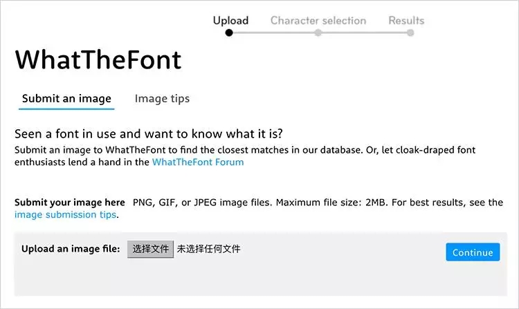 設(shè)計師經(jīng)常碰到的一個場景是,搜集到一些很贊設(shè)計作品,進(jìn)而想知道圖片中所使用的字體。這種情況下我們就可以使用一些通過上傳圖片來進(jìn)行字體識別的服務(wù)。提供識別圖片中的西文字體的網(wǎng)站較多,有大名鼎鼎的在線商業(yè)字體銷售平臺 MyFonts 旗下的 WhatTheFont;也有高質(zhì)量免費西文字體下載網(wǎng)站 Font Squirrel 提供的Font Identifier 以及 WhatFontis 等。