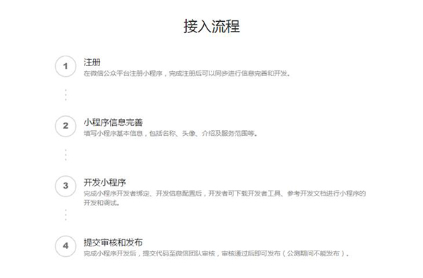 3、開(kāi)發(fā)小程序:完成小程序開(kāi)發(fā)者綁定、開(kāi)發(fā)信息配置后,開(kāi)發(fā)者可下載開(kāi)發(fā)者工具、參考開(kāi)發(fā)文檔進(jìn)行小程序的開(kāi)發(fā)和調(diào)試。