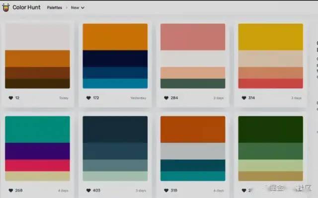 配色工具color hunt一個(gè)配色工具網(wǎng)站可以按照不同分類搜索模板,且能看到每種配色的點(diǎn)贊數(shù).