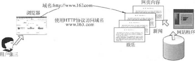 以張三訪問網(wǎng)頁為例,用戶張三通過網(wǎng)站域名www.163.com請求訪問網(wǎng)易網(wǎng)站,網(wǎng)易 網(wǎng)站從空間中取出網(wǎng)頁內容,經(jīng)過網(wǎng)站程序解析為瀏覽器可以識別的格式,通過HTTP協(xié) 議,發(fā)送給張三,整個過程如圖所示。