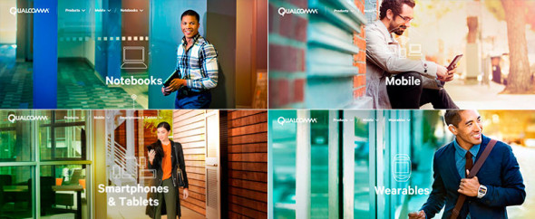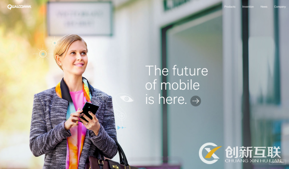 美國高通網(wǎng)站的品牌宣傳圖片讓人印象深刻,品牌特點獨樹一熾,顏色上運用冷暖搭配,加以漸變效果巧妙地疊加于圖片上,雖然顏色種類不多,但能在風格、品牌上具有強烈的統(tǒng)一性,讓人對品牌辨識度有更加深刻的記憶性。