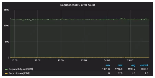 圖1:某Tomcat實(shí)例在1000+qps下請求數(shù)和錯誤數(shù)的比例