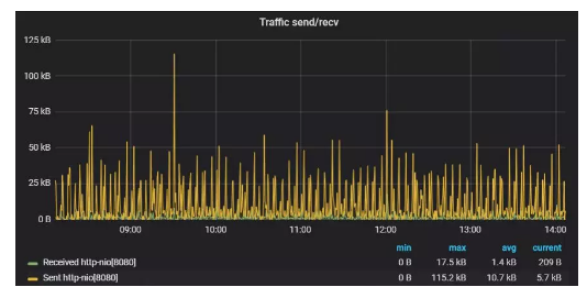 流量監(jiān)控關(guān)注的是當(dāng)前系統(tǒng)或應(yīng)用的流量,以便更好地衡量服務(wù)的承載能力。針對Tomcat流量監(jiān)控,我們需要關(guān)注Tomcat實(shí)例發(fā)送和接收的流量。