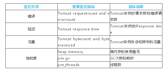 通過對黑盒、白盒監(jiān)控的理解,結(jié)合監(jiān)控的四個黃金指標(biāo),針對Tomcat的重要監(jiān)控指標(biāo),可以從以下幾個方面進(jìn)行考慮: