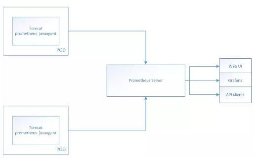 容器環(huán)境下Tomcat+Prometheus+Grafana簡圖如下:
