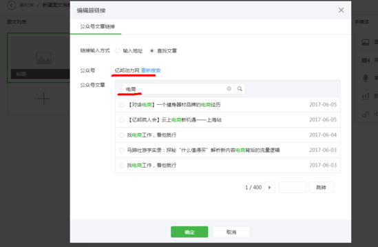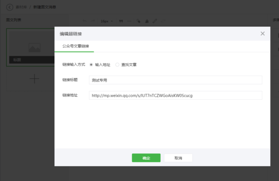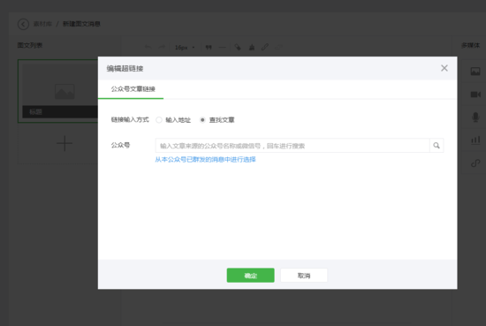 復(fù)制想要插入的公眾文章鏈接,粘貼在“鏈接地址”,后臺(tái)將自動(dòng)匹配好相關(guān)的文章。或者直接插入自己賬號(hào)的文章。但目前輸入文章鏈接地址僅支持公眾號(hào)文章鏈接,無法插入外鏈。