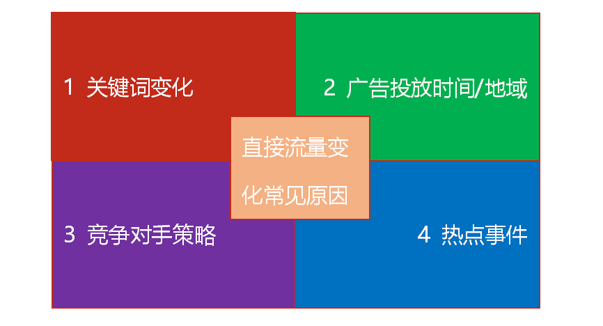 付費搜索流量是指通過搜索引擎購買關鍵詞及對搜索引結果廣告位進行競價的方式,例如:百度競價排名流量、Google Adwords流量等。引起SEM變化原因有:關鍵詞變化、廣告投放時間/地域、競爭對手策略、熱點事件。