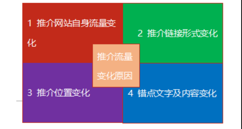(1)推介網(wǎng)站自身流量變化 推介網(wǎng)站自身的流量大小決定了我們可以從網(wǎng)站上獲得的流量。例如,當發(fā)現(xiàn)來自推介網(wǎng)站的流量逐步升高,并且質量變化不大,而我們又沒有在推介網(wǎng)站增加或者修改推介鏈接的方式,那有可能就是推介網(wǎng)站自身流量的變化; (2)推介鏈接形式變化 改變推介鏈接形式是會影響流量變化的,例如文字鏈接和圖片鏈接獲得的流量就不一樣,如推介網(wǎng)站自身流量變化不大,但某個推介頁面流量有變化,那就需要檢查這個頁面的鏈接形式了; (3)推介位置變化 都知道,一個網(wǎng)站中首頁和內頁獲得流量相差巨大,同一個頁面的首屏和底部點擊量也是相差很多。所以,改變鏈接所在的頁面及頁面位置也會影響推介流量的變化; (4)鏈接文字及內容變化 這是指更改文字鏈接的描述,或圖片的顏色、內容造成的推介網(wǎng)站流量變化。由于訪客對顏色鮮艷、文字誘人的鏈接感興趣,所以推介鏈接流量變化時候可檢查鏈接文字及圖片內容 。 流量的波動變化是網(wǎng)站分析及網(wǎng)站運營人員日常工作的重要部分,基于流量細分,弄清流量波動的原因、記錄原因,能有助于我們快速有效的定位問題及預測問題。