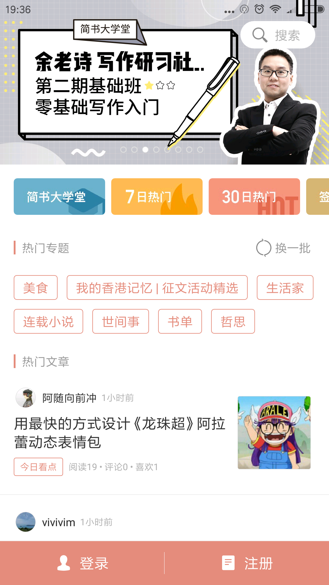 例如簡書,在簡書,不登錄,除了無法使用點贊或者收藏等功能,基本不影響你對閱讀文章功能的使用,但是如果你想要使用“寫文章”的功能,則必須要進行登錄與注冊。