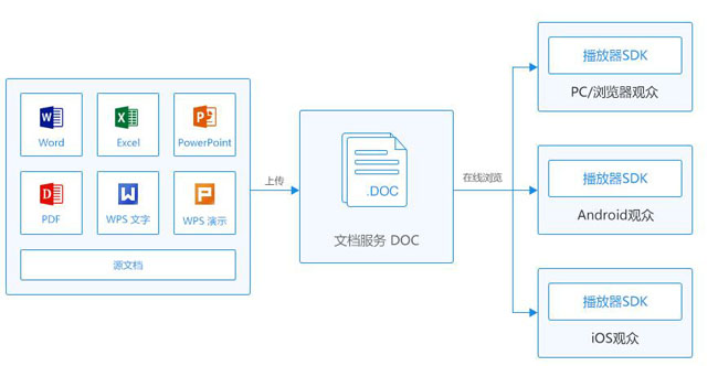 DOC提供文檔存儲(chǔ)、轉(zhuǎn)碼、分發(fā)播放一站式服務(wù),您通過(guò)SDK上傳源文檔后,DOC會(huì)自動(dòng)進(jìn)行轉(zhuǎn)碼;轉(zhuǎn)碼成功后,通過(guò)PC/WAP瀏覽器、Android、iOS播放器SDK嵌入您的應(yīng)用中,實(shí)現(xiàn)免插件、在線瀏覽。支持的格式有:源文檔支持doc、docx、ppt、pptx、xls、xlsx、vsd、pot、pps、rtf、wps、et、dps、pdf、txt、epub多種格式。