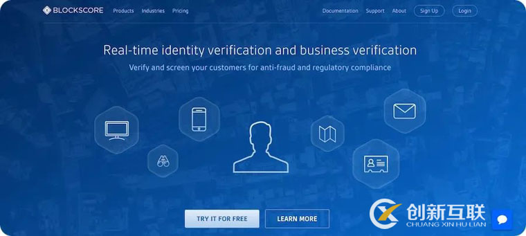 BlockScore是一個解決身份盜用的身份驗(yàn)證服務(wù)網(wǎng)站。 網(wǎng)站設(shè)計也使用城市的鳥瞰圖,白色文字和圖標(biāo),充滿質(zhì)感。
