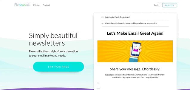 Flowmail是一個電子郵件新聞組的網(wǎng)站,它有一個漂亮的登錄頁面。 在右側(cè),一個小動畫清楚地顯示了該工具如何以簡單,有吸引力和快速的方式設(shè)計自己的訂閱電子郵件。 動畫的內(nèi)容回應(yīng)了產(chǎn)品的介紹,最終CTA自然出現(xiàn)。 設(shè)計非常精巧和巧妙。