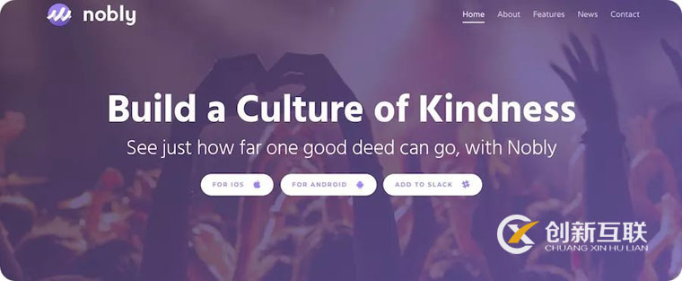Nobly是一款社交應(yīng)用程序,您可以與想要為世界做一件好事的所有人聯(lián)系。 打開網(wǎng)站后,您會看到主頁的大圖,它吸引了人們的注意力,大膽的色彩和點(diǎn)綴。 該網(wǎng)站使用現(xiàn)在流行的簡單布局和單頁滾動設(shè)計。