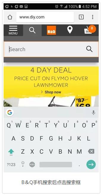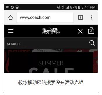 然而,在Coach手機(jī)網(wǎng)站上,點(diǎn)擊搜索圖標(biāo)激活搜索后,您仍然必須在搜索框內(nèi)點(diǎn)擊打開鍵盤并開始輸入。