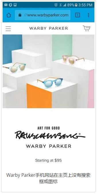在Warby Parker的下面的例子中,網(wǎng)站搜索實(shí)際上從主屏幕不可用; 您必須點(diǎn)擊菜單圖標(biāo)才能訪問它。這將大大減少使用搜索功能的訪問者人數(shù)。