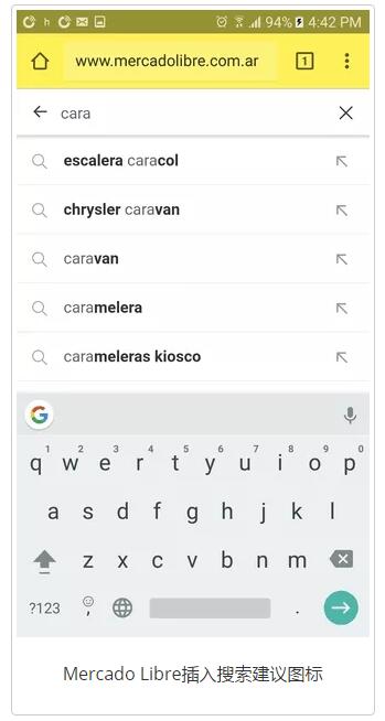 在Mercado Libre的這個(gè)例子中,點(diǎn)擊任何向上的箭頭圖標(biāo)將搜索建議插入到搜索框中,并根據(jù)新的短語(yǔ)顯示新的建議。