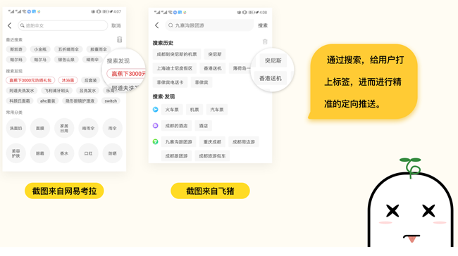 為用戶打上不同的標簽,用于區(qū)分不同用戶群體,分類精準定向推送產(chǎn)品,例如:考拉的搜索發(fā)現(xiàn)。
