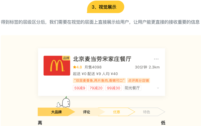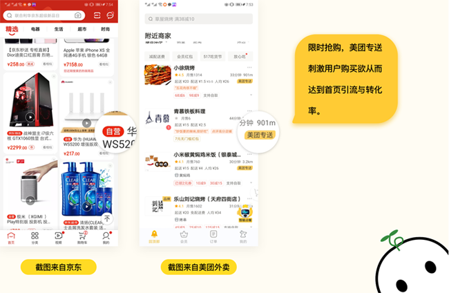 標簽還可用于吸引用戶注意,建立好感,直擊對應痛點,提升用戶購買欲,提高點擊率與轉(zhuǎn)化率,最終促使用戶下單。例如電商類型的限時搶購、京東自營、美團專送等。