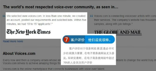 客戶評(píng)價(jià)可以和網(wǎng)站所要傳遞的優(yōu)勢(shì)相互印證,以增強(qiáng)網(wǎng)站的信任力。在這個(gè)例子中,紐約時(shí)報(bào)評(píng)價(jià)所闡述的內(nèi)容,正是該網(wǎng)站在前面的優(yōu)勢(shì)中提到的免費(fèi)發(fā)布任務(wù)和一小時(shí)內(nèi)獲得反饋印證。真實(shí)的客戶評(píng)價(jià)可以讓我們的網(wǎng)站不至于給人一種“王婆賣瓜自賣自夸”的印象。客戶評(píng)價(jià)盡量圖文并茂,客戶評(píng)價(jià)中有評(píng)價(jià)者的照片、留言和簽名,這樣更可信。