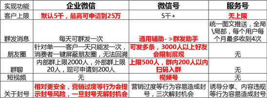 客戶上限方面,企業(yè)微信默認5千,高可以申請到25萬,微信號5千+,最近微信已經(jīng)就微信5000人的上限進行了擴容,而服務(wù)號是無上限。