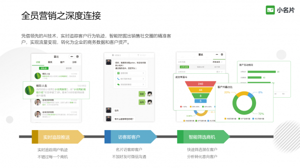 從2018年起,智能名片類小程序爆紅,主打“新一代智能社交名片”的小名片也是其中之一。小名片小程序在8個(gè)月內(nèi)獲得5家機(jī)構(gòu)近億融資,產(chǎn)品矩陣用戶超3000萬,影響企業(yè)超50萬家,在全國各地有上百家服務(wù)商。智能社交小名片能有如此勢頭,除了產(chǎn)品功能、團(tuán)隊(duì)等內(nèi)因,“為銷售賦能”、“幫助企業(yè)精準(zhǔn)獲客”、“提升企業(yè)業(yè)績”這些都是更能打動(dòng)市場的賣點(diǎn)。