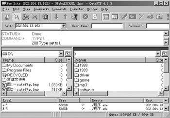 添加了站點之后,在站點管理窗口中選擇一個FTP(注意只能選擇一個FTP站點),與之建立連接。連接到服務(wù)器以后,CuteFTP的窗口被分成左右兩個窗格。左邊的窗格顯示本地硬盤的文件列表,右邊的窗格顯示遠(yuǎn)程硬盤上的文件列表。文件列表的顯示方式和Windows的資源管理器完全一樣,如圖2所示。