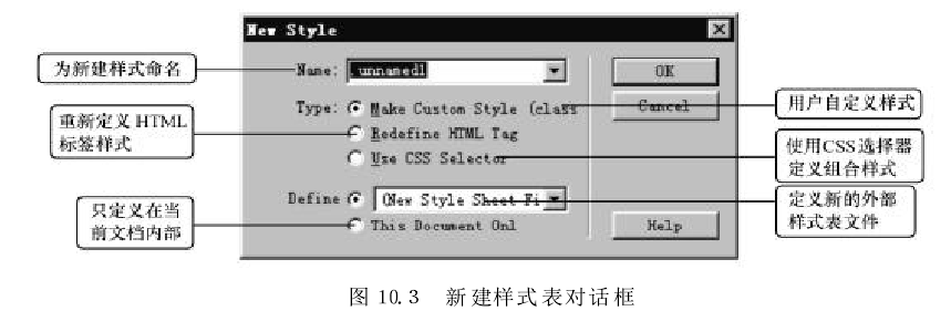 2.使用CSS樣式面板創(chuàng)建樣式單擊圖標(或單擊菜單按鈕上,從彈出的菜單中選擇"NewStyle"命令),打開"NewStyle(新建樣式)”對話框,如圖所示。