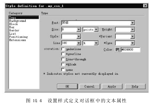 (2)定義"Type(文字)"面板在彈出的"StyleDefinition(樣式定義)”對話框的"Category"列表框中,選擇"-Type"項,出現(xiàn)"Type"設(shè)置面板,設(shè)置my-css-1樣式的各種屬性,如圖10.4所示。