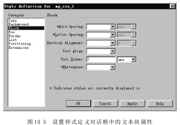 (3) 定義Block(文本塊)面板在圖10.4所示對話框的"Category"列表框中,選擇"Block"項,出現(xiàn)"Block"設(shè)置面板,設(shè)置mycss_1樣式的屬性,如圖10.5所示,單擊“OK"按鈕。在如圖10.2所示的CSS樣式面板上將出現(xiàn)新定義的樣式my-css_1.