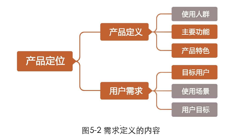 ●產(chǎn)品定位的內(nèi)容產(chǎn)品定位實(shí)際上就是關(guān)于產(chǎn)品的目標(biāo)、范圍、特征等約束條件,它包括兩方面的內(nèi)容:產(chǎn)品定義和用戶需求。產(chǎn)品定義主要由產(chǎn)品經(jīng)理從網(wǎng)站角度考慮,用戶需求主要由設(shè)計(jì)師從用戶角度考慮。最終的產(chǎn)品定位應(yīng)該是綜合考慮兩者關(guān)系的結(jié)果。需求定義的內(nèi)容如圖5-2所示。