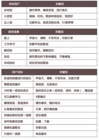 需要說明的是,休閑型、小資型、達(dá)人型用戶雖然有區(qū)別,但他們之間并不是絕對獨(dú)立和互斥的關(guān)系,他們的一些使用場景和用戶目標(biāo)甚至是重合的,比如休閑型和小資型用戶可能都有分享音樂的需求。因此在發(fā)散使用場景和用戶目標(biāo)時(shí),不需要太受人群類型的限制。"放”得越寬,“收”的時(shí)候才越有選擇余地,越不會遺漏重要內(nèi)容。