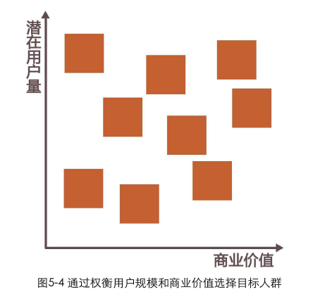 該選擇哪種類型作為產(chǎn)品的目標(biāo)用戶,需要綜合權(quán)衡用戶對公司的價(jià)值以及潛在需求量。別忘了,平衡商業(yè)價(jià)值和用戶需求本來就是設(shè)計(jì)師需要特別關(guān)注到的。在一個(gè)坐標(biāo)平面上對潛在用戶進(jìn)行分布羅列,坐標(biāo)平面的2個(gè)坐標(biāo)軸分別是潛在用戶量和商業(yè)價(jià)值(包含對推廣、營銷成本的考慮),如圖5-4所示。我們優(yōu)先考慮最右上角那些潛在用戶量大和商業(yè)價(jià)值大(推廣成本低)的用戶。因?yàn)橐瑫r(shí)考慮到產(chǎn)品利益和用戶需求,所以這項(xiàng)工作最好由產(chǎn)品經(jīng)理和設(shè)計(jì)師配合完成。