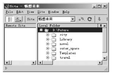 (2)在D盤的根文件夾下建立一個(gè)文件夾“Future'”,在Future下建建立一個(gè)子文件夾city用來存放“暢想未來”網(wǎng)站中“未來都市”欄目的有關(guān)文件,然后再在city文件夾下建立下級(jí)子文件夾,如Images、sounds及swf等。同樣地,在Future下建立其他各個(gè)文件夾(如圖所示)