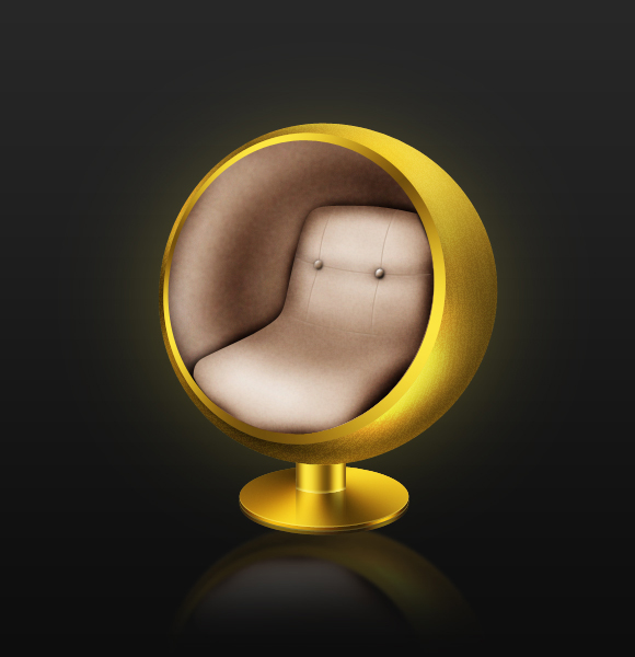 之所以會引出要討論圖層疊加混合模式的問題,是由于我個人按照網(wǎng)上的教程在做圖標設(shè)計練習(xí)的時候,發(fā)現(xiàn)設(shè)計師有意識的使用了圖層疊加來增加明暗的對比度,創(chuàng)建出了非常好的色彩效果,而如果不了解疊加混合模式的原理的話,很難想到用這樣的方式來完成設(shè)計。下面就是我在練習(xí)中要完成的設(shè)計,一個復(fù)古的圓形金色座椅: