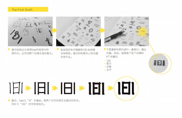 最開(kāi)始我們過(guò)分強(qiáng)調(diào)logo的視覺(jué)化和圖形化,從而忽略了品牌本身的意義,也發(fā)現(xiàn)了所有手稿都和181雜貨鋪沒(méi)有聯(lián)系,意識(shí)到和客戶(hù)的溝通非常不足。于是重新和委托進(jìn)行一番探討,通過(guò)溝通,談話(huà),我提煉了這個(gè)品牌的4個(gè)關(guān)鍵詞:181,復(fù)古,交換,文字。