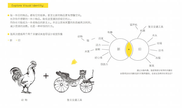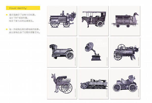 我們收集了大量關(guān)于表達(dá)新舊主題的視覺(jué)元素,最后融合了動(dòng)物與舊機(jī)器,設(shè)計(jì)了8個(gè)視覺(jué)形象,結(jié)合了新與舊交替的品牌理念。每一件就物品背后都有她的故事,她比新物品多了無(wú)限的想象空間。
