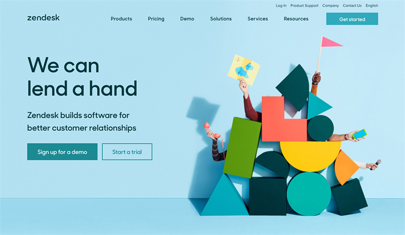 Zendesk用形象的概念圖來輔助傳達(dá)產(chǎn)品的價(jià)值主張——We can lend a hand。