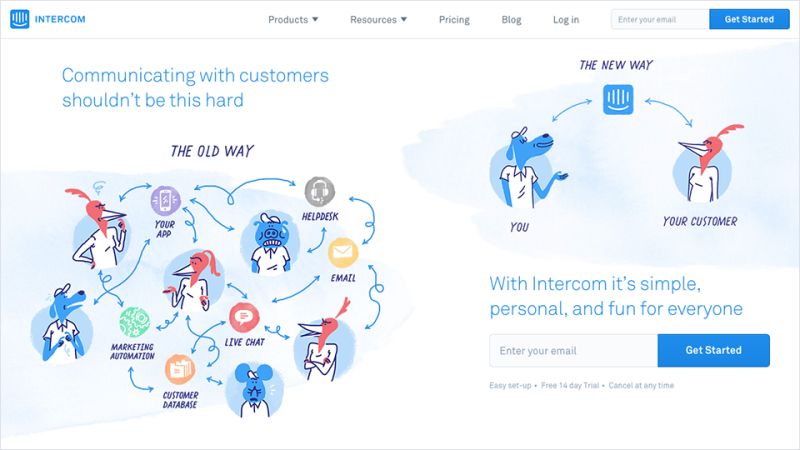 Intercom用生動(dòng)的手繪風(fēng)插畫描繪了一副工作中遭遇的混亂場(chǎng)景,引出了使用Intercom可以結(jié)束這一切混亂的概念: