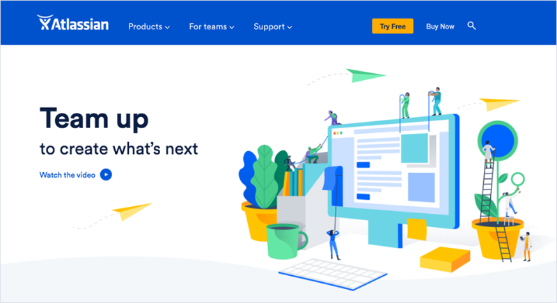 Atlassian用配色明快的圖形插畫描繪了齊心協(xié)力的工作場(chǎng)景,烘托出“Team up”的產(chǎn)品價(jià)值主張: