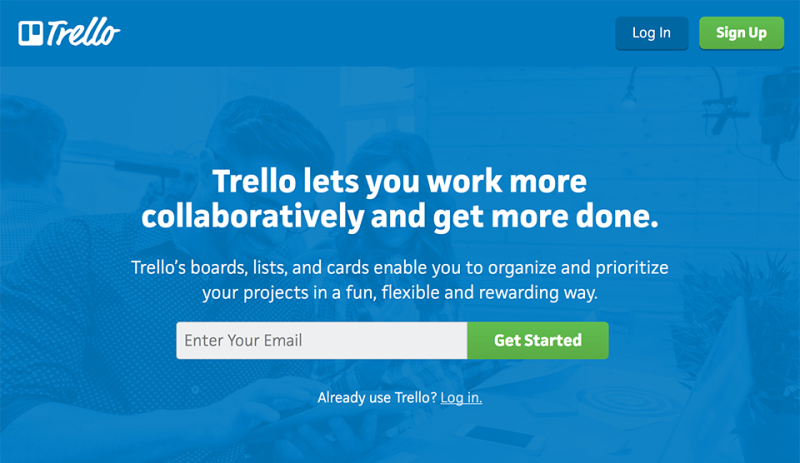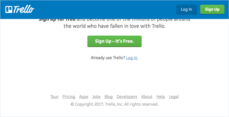 例如辦公協(xié)作應(yīng)用Trelllo的官網(wǎng)頂部沒有導(dǎo)航,只保留了登陸和注冊(cè)入口。頁面的信息組織按照“頭圖-功能總覽-功能細(xì)節(jié)-客戶展示-注冊(cè)試用”的順序由淺入深、從宏觀到微觀的順序引導(dǎo)訪客完成瀏覽和轉(zhuǎn)化。到頁面底部才會(huì)出現(xiàn)一排弱弱的鏈接: