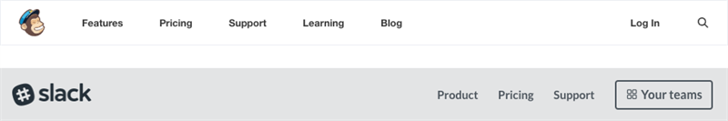例如企業(yè)郵件應(yīng)用Mailchimp和Slack就是扁平結(jié)構(gòu)的典型代表,它們的導(dǎo)航都只有一級(jí),把所有頁面入口都放在外面,最重要的功能、定價(jià)位于前兩個(gè)位置,其余的根據(jù)重要性遞減排列,最右邊一般會(huì)放注冊(cè)或登陸入口:
