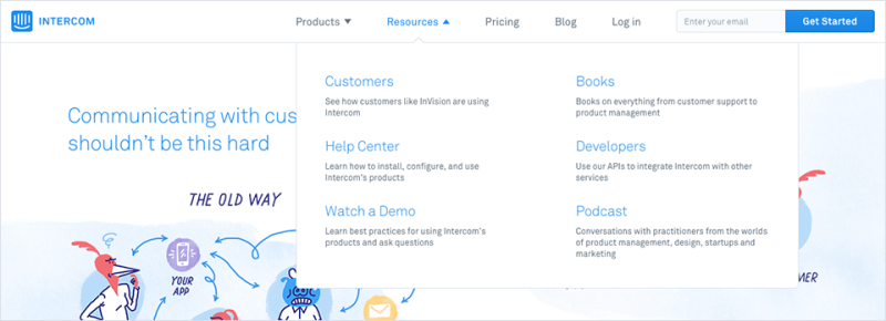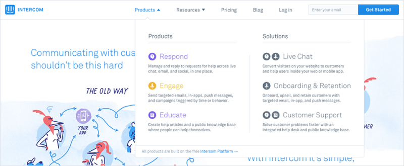 以Intercom為例,它是一款大型CRM應(yīng)用,公司旗下有三大子產(chǎn)品。官網(wǎng)首頁設(shè)置了5個(gè)一級(jí)導(dǎo)航,其中前兩個(gè)是折疊導(dǎo)航。最重要的Products導(dǎo)航的下拉菜單中按照產(chǎn)品和解決方案兩個(gè)維度展示了對(duì)應(yīng)的信息。配合icon和簡(jiǎn)介,有序又直觀: