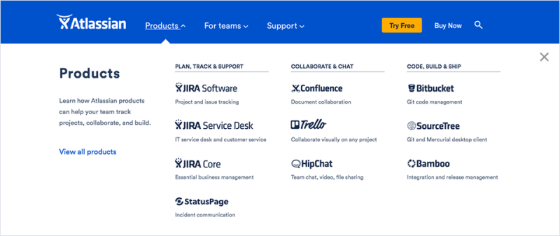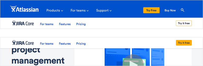 再看看Atlassian的設(shè)計(jì)。到達(dá)子產(chǎn)品頁后會(huì)保留主導(dǎo)航,隨著頁面滾動(dòng),子產(chǎn)品導(dǎo)航會(huì)把主導(dǎo)航推出,繼而代替主導(dǎo)航的位置: