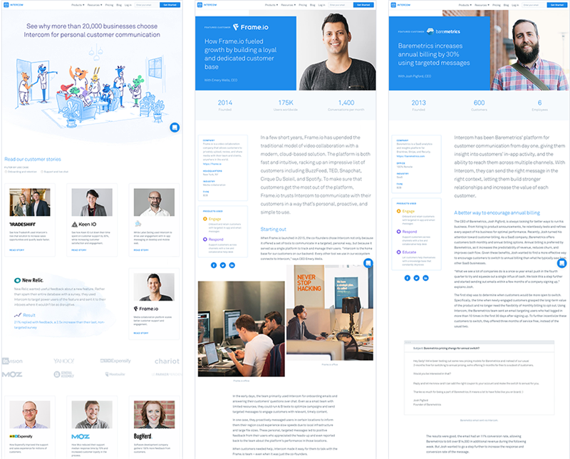 Intercom在客戶故事這方面下足了功夫,每個(gè)重點(diǎn)客戶都有內(nèi)容豐富的專題頁,里面有客戶公司簡(jiǎn)介,描述了用Intercom的哪些產(chǎn)品解決了哪些問題,有從他們產(chǎn)品角度出發(fā)的第三人稱描述,也有客戶的第一人稱陳述: