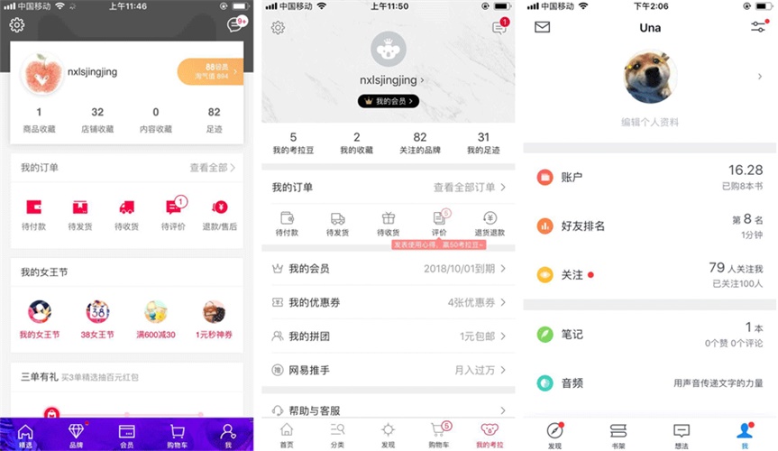 示例如下,分別是天貓,嚴(yán)選,微信讀書的個人中心截圖。